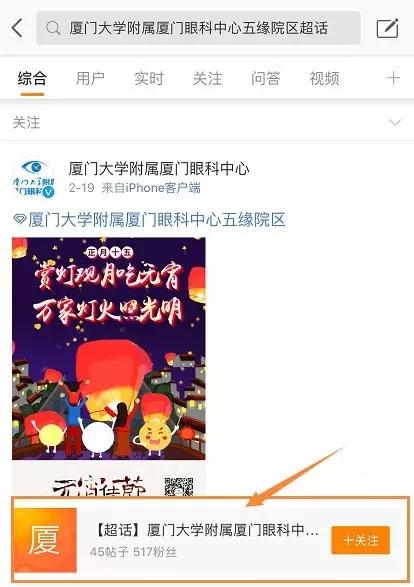 ?、俅蜷_新浪微博,點(diǎn)擊“發(fā)現(xiàn)”,搜索“廈門大學(xué)附屬?gòu)B門眼科中心五緣院區(qū)”;