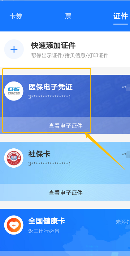 進(jìn)入支付寶,點(diǎn)擊“卡包”-“證件”-“醫(yī)保電子憑證”