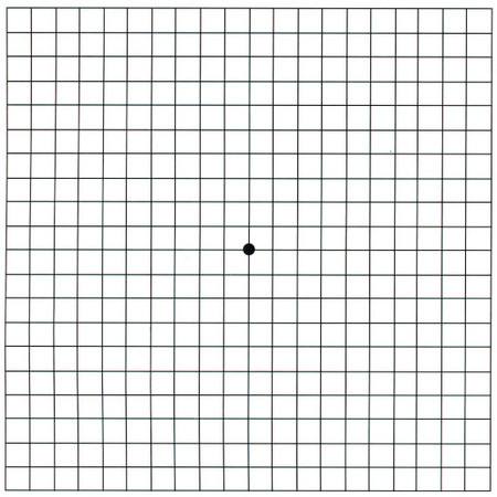 有一種簡(jiǎn)單且能夠及早發(fā)現(xiàn)老年性黃斑變性的方法,叫做阿姆斯勒方格(如下圖)。這是一個(gè)打印的正方形的小格子,類似于棋盤格,尺寸一般是15厘米X15厘米。患者可以把它貼在冰箱上,每隔一周擋住一側(cè)眼睛看一看,如果發(fā)現(xiàn)自己任何一側(cè)的眼睛看到格子變形了,就需要來(lái)看醫(yī)生了。